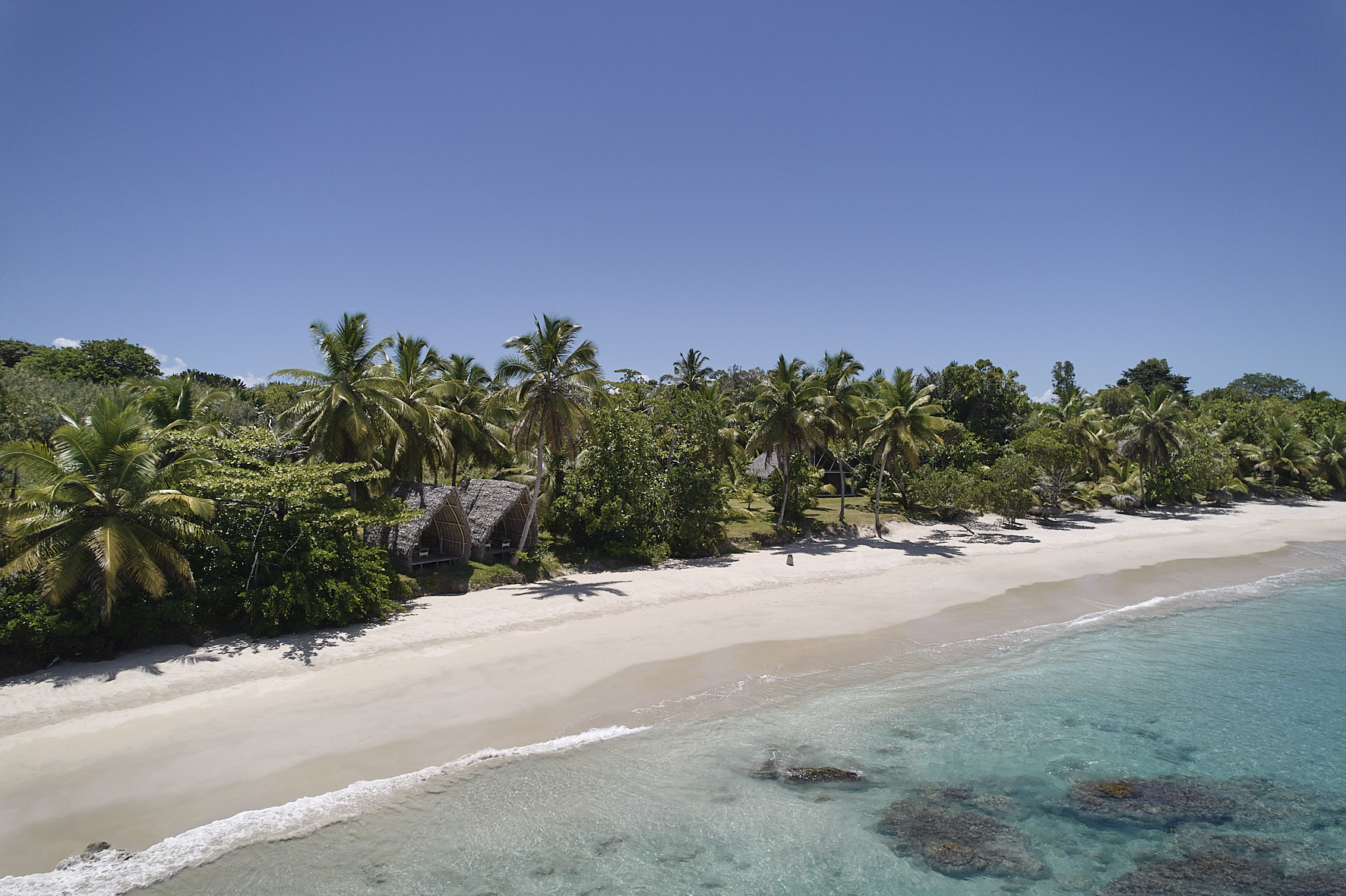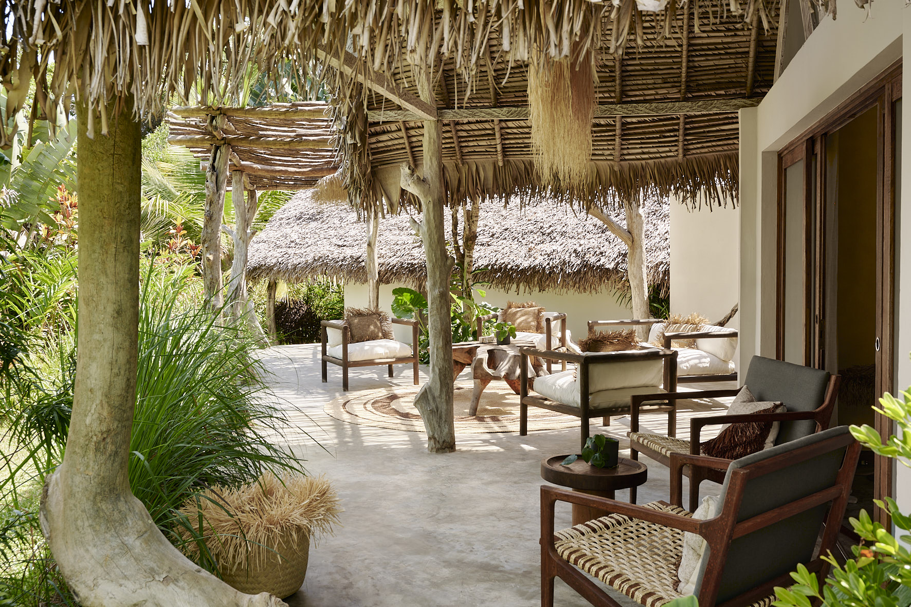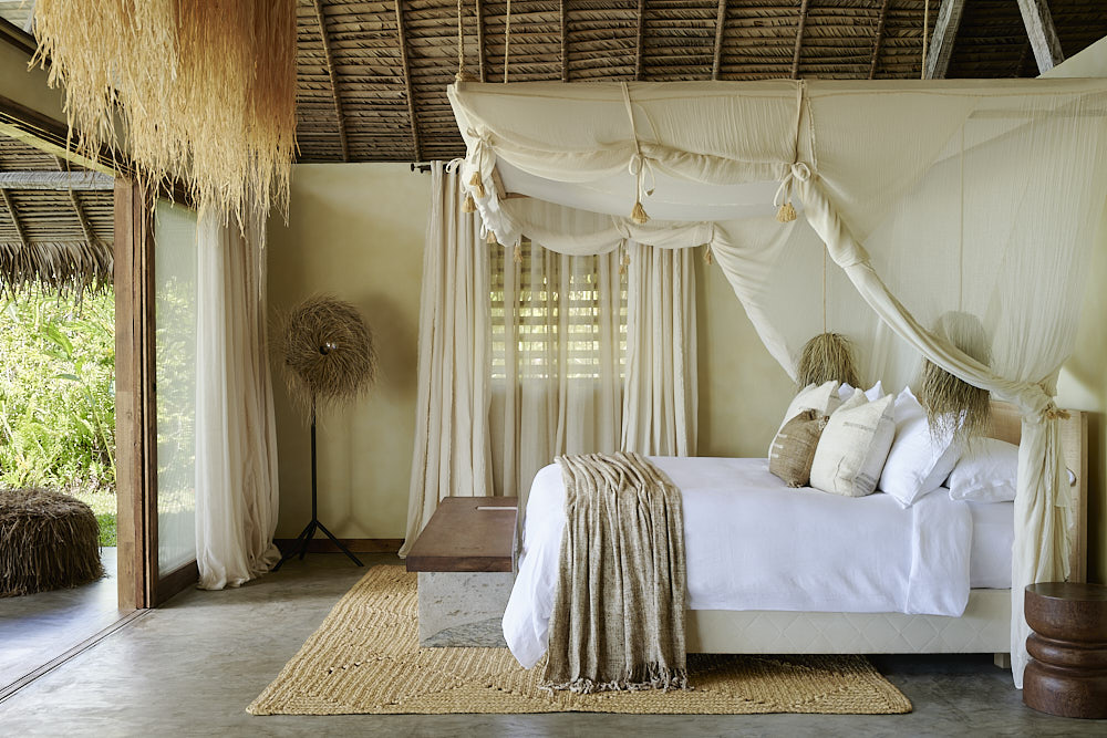 All are set just back from the beach, with uninterrupted views framed by palms. The style is natural and tactile—driftwood beams, soft linen, locally made furniture, and open-fronted living spaces that blur the line between inside and out.