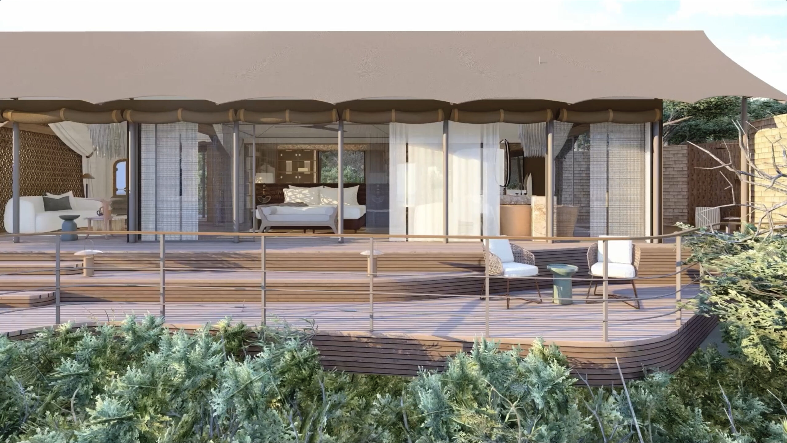 The lodge offers a collection of 12 beautifully appointed tented suites – 11 tented suites and one 2 bedroomed family suite. Each suite has been carefully designed to combine safari authenticity with modern sophistication – spacious bedrooms open onto private decks with uninterrupted views across the plains, while interiors feature elegant furnishings, natural materials, and subtle cultural accents. En‑suite bathrooms with both indoor and outdoor showers create a seamless connection with the surrounding wilderness.